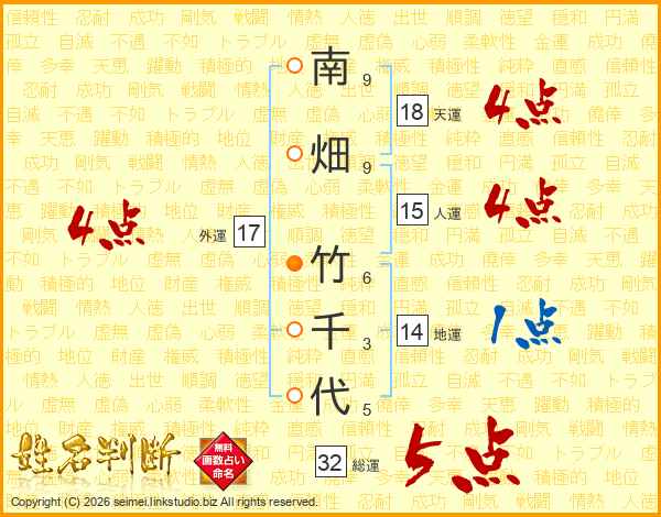 生活面を象徴する運勢です。外部から受ける影響力を表し、結婚運、家庭運や職場、環境への順応性を表します。総運から人運を引いた画数。姓や名が1文字の場合を除く。