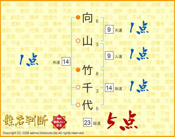 生活面を象徴する運勢です。外部から受ける影響力を表し、結婚運、家庭運や職場、環境への順応性を表します。総運から人運を引いた画数。姓や名が1文字の場合を除く。