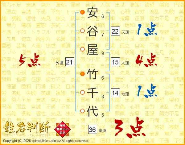 安(6画)谷(7画)屋(9画) 竹(6画)千(3画)代(5画)