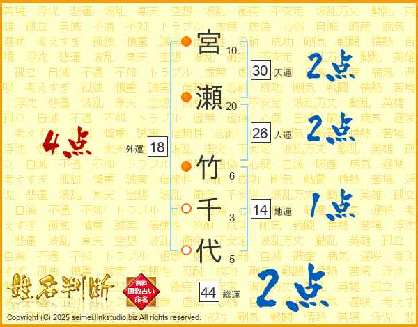 宮(10画)瀬(20画) 竹(6画)千(3画)代(5画)