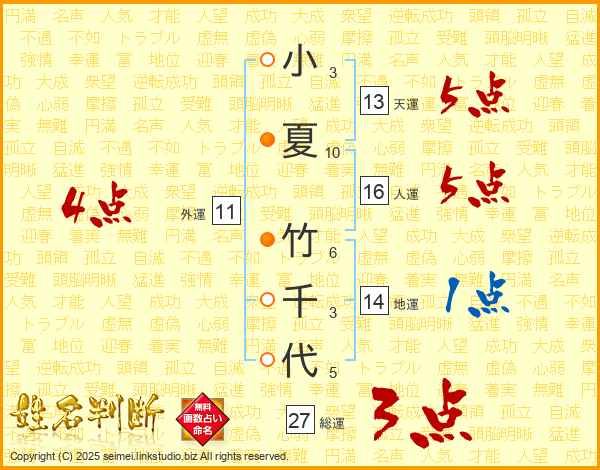 生活面を象徴する運勢です。外部から受ける影響力を表し、結婚運、家庭運や職場、環境への順応性を表します。総運から人運を引いた画数。姓や名が1文字の場合を除く。
