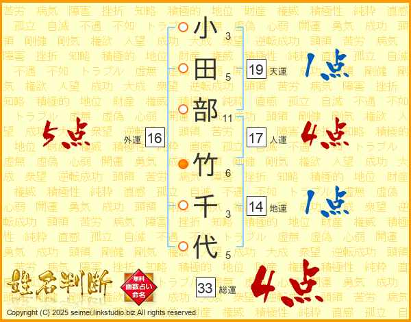 生活面を象徴する運勢です。外部から受ける影響力を表し、結婚運、家庭運や職場、環境への順応性を表します。総運から人運を引いた画数。姓や名が1文字の場合を除く。