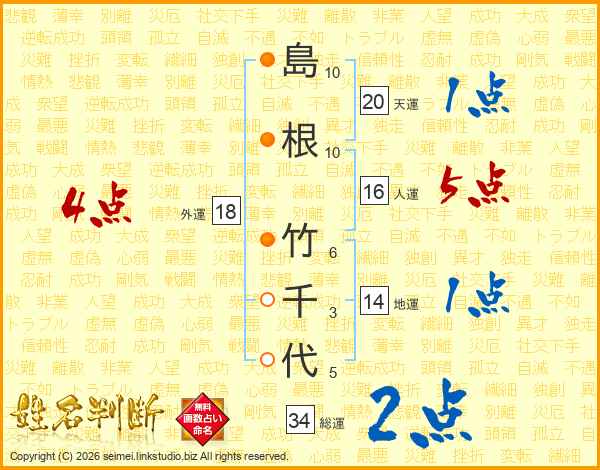 島(10画)根(10画) 竹(6画)千(3画)代(5画)