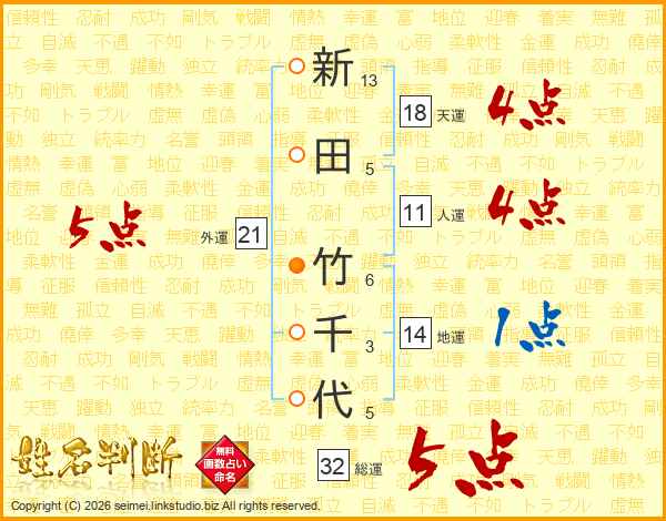 新(13画)田(5画) 竹(6画)千(3画)代(5画)