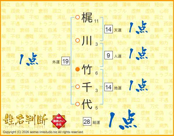梶(11画)川(3画) 竹(6画)千(3画)代(5画)