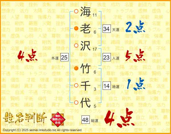 生活面を象徴する運勢です。外部から受ける影響力を表し、結婚運、家庭運や職場、環境への順応性を表します。総運から人運を引いた画数。姓や名が1文字の場合を除く。