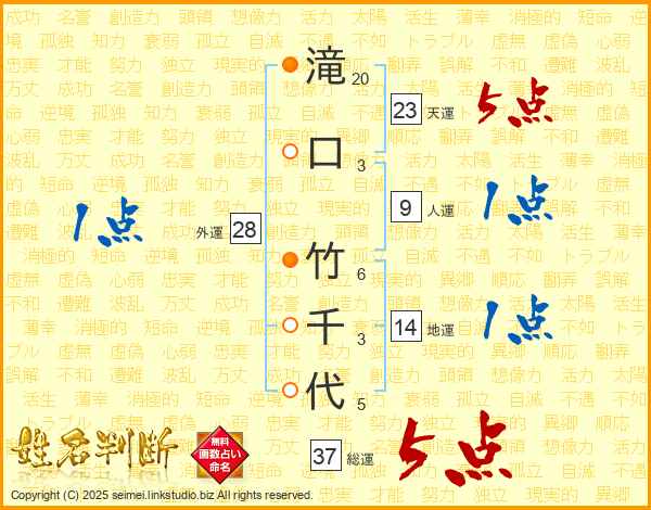 滝(20画)口(3画) 竹(6画)千(3画)代(5画)
