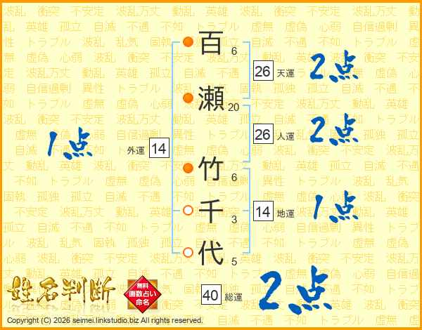百(6画)瀬(20画) 竹(6画)千(3画)代(5画)