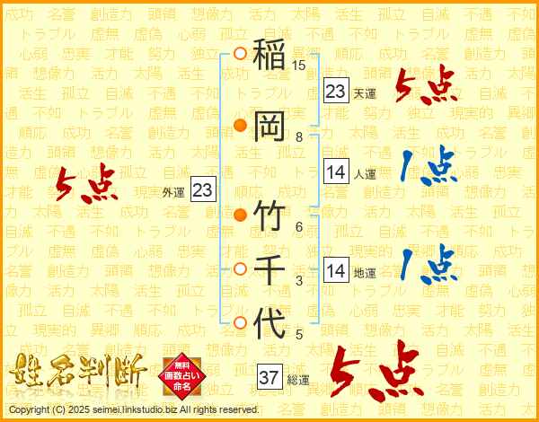 稲(15画)岡(8画) 竹(6画)千(3画)代(5画)