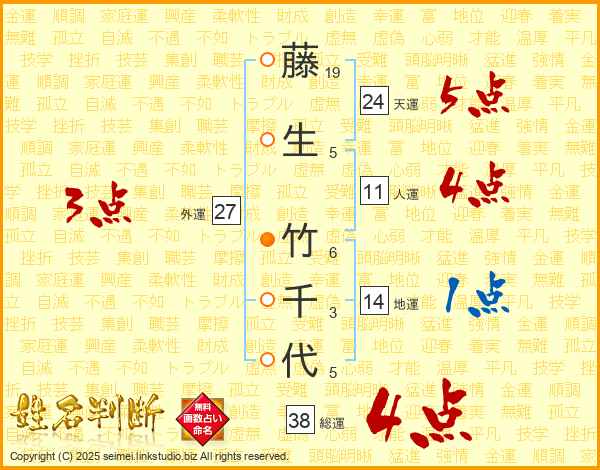 藤(19画)生(5画) 竹(6画)千(3画)代(5画)