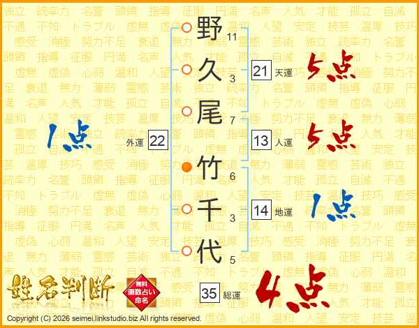 野(11画)久(3画)尾(7画) 竹(6画)千(3画)代(5画)
