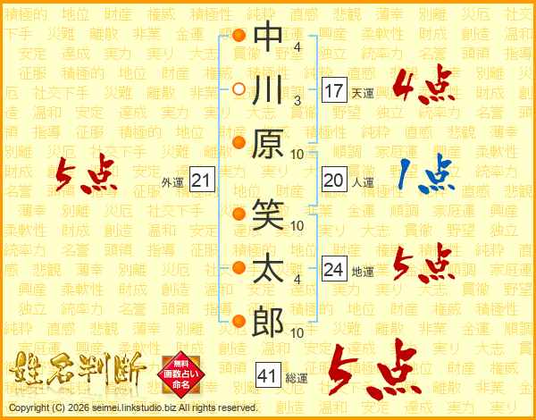 中(4画)川(3画)原(10画) 笑(10画)太(4画)郎(10画)