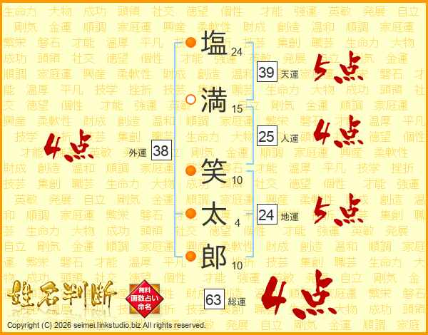 塩(24画)満(15画) 笑(10画)太(4画)郎(10画)
