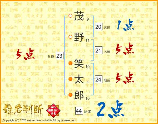 茂野笑太郎さんの人運は21画の5点!