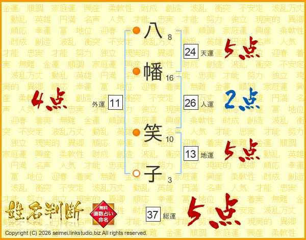 八幡笑子さんの総運は37画の5点!