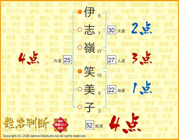 伊(6画)志(7画)嶺(17画) 笑(10画)美(9画)子(3画)