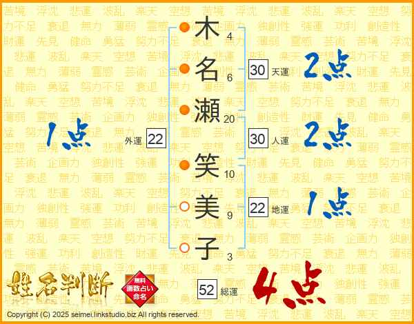 木(4画)名(6画)瀬(20画) 笑(10画)美(9画)子(3画)