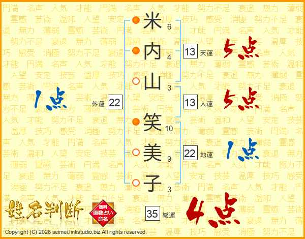 米(6画)内(4画)山(3画) 笑(10画)美(9画)子(3画)