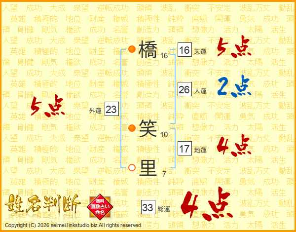 生活面を象徴する運勢です。外部から受ける影響力を表し、結婚運、家庭運や職場、環境への順応性を表します。総運から人運を引いた画数。姓や名が1文字の場合を除く。