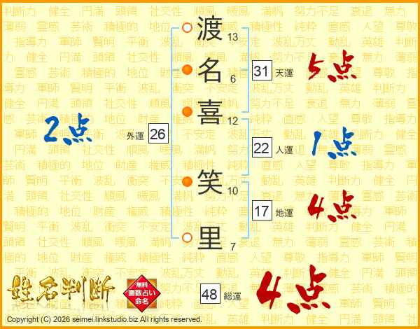 渡(13画)名(6画)喜(12画) 笑(10画)里(7画)