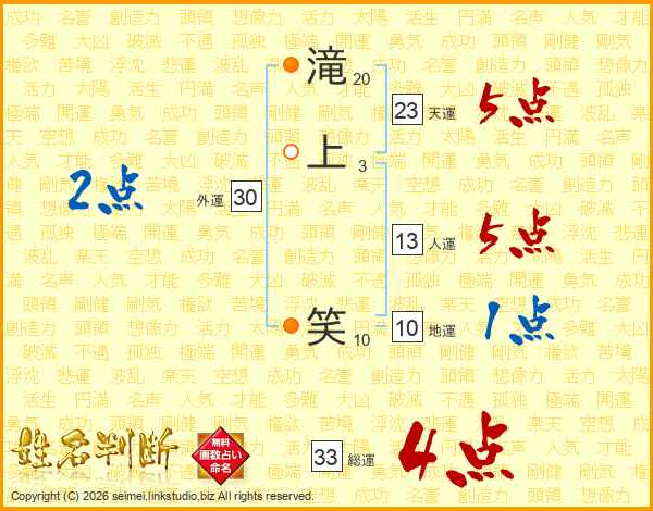 滝上笑さんの天運は23画の5点!