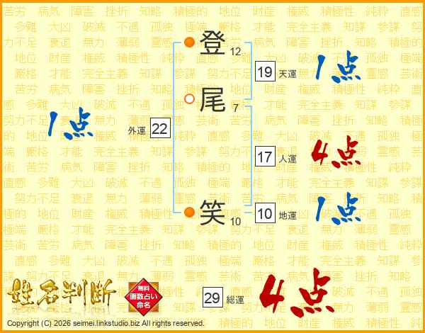 生活面を象徴する運勢です。外部から受ける影響力を表し、結婚運、家庭運や職場、環境への順応性を表します。総運から人運を引いた画数。姓や名が1文字の場合を除く。