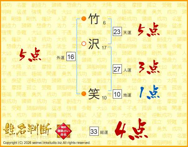竹沢笑さんの総運は33画の4点!