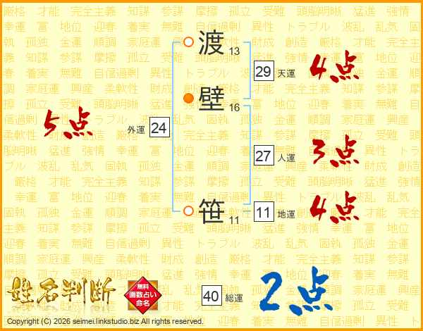 生活面を象徴する運勢です。外部から受ける影響力を表し、結婚運、家庭運や職場、環境への順応性を表します。総運から人運を引いた画数。姓や名が1文字の場合を除く。