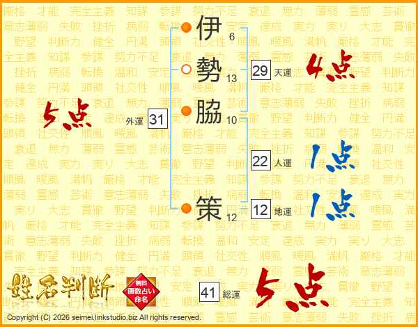 伊勢脇策さんの総運は41画の5点!