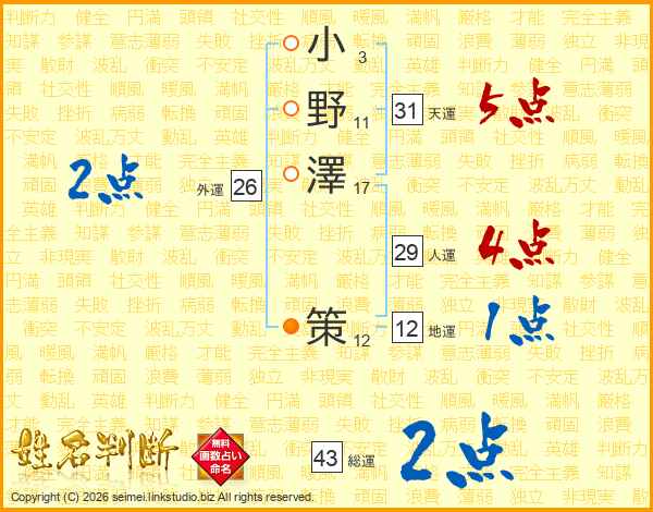 あなたの人生を表す1番重要な運勢です。生涯を通じて影響する総合運となり、主に50歳以降の晩年期に影響を及ぼします。苗字と名前の合計画数。
