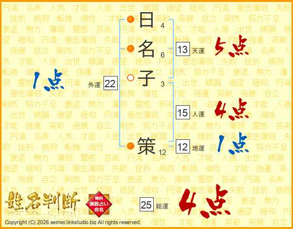 日(4画)名(6画)子(3画) 策(12画)