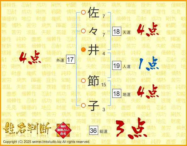 佐(7画)々(7画)井(4画) 節(15画)子(3画)