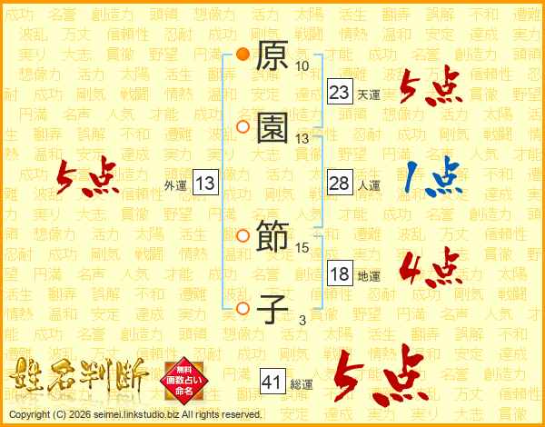 あなたの人生を表す1番重要な運勢です。生涯を通じて影響する総合運となり、主に50歳以降の晩年期に影響を及ぼします。苗字と名前の合計画数。