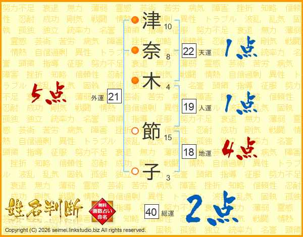 津(10画)奈(8画)木(4画) 節(15画)子(3画)