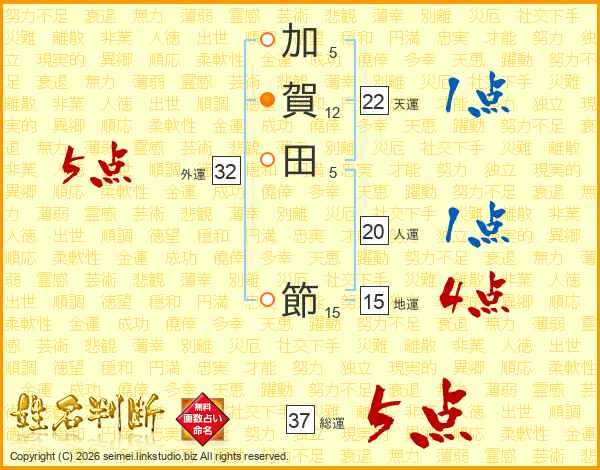 生活面を象徴する運勢です。外部から受ける影響力を表し、結婚運、家庭運や職場、環境への順応性を表します。総運から人運を引いた画数。姓や名が1文字の場合を除く。