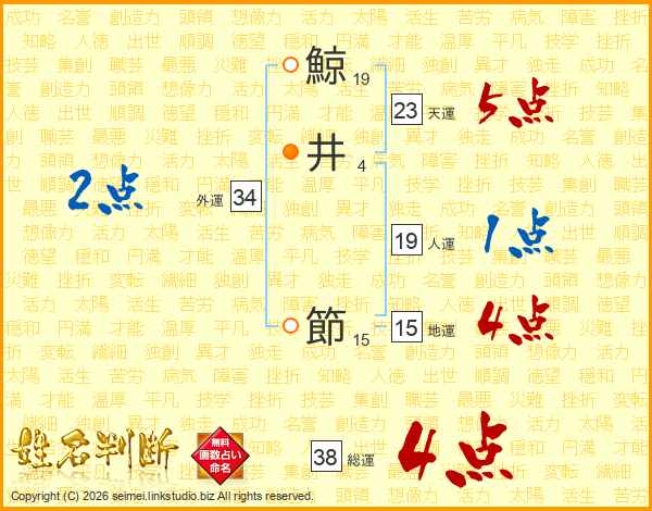 生活面を象徴する運勢です。外部から受ける影響力を表し、結婚運、家庭運や職場、環境への順応性を表します。総運から人運を引いた画数。姓や名が1文字の場合を除く。