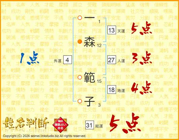 あなたの人生を表す1番重要な運勢です。生涯を通じて影響する総合運となり、主に50歳以降の晩年期に影響を及ぼします。苗字と名前の合計画数。