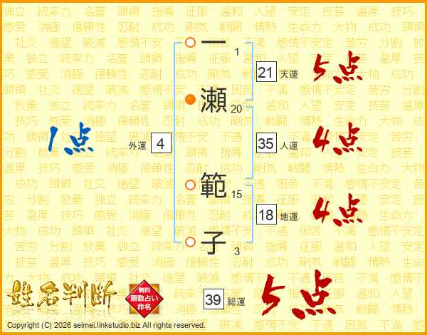 家系が持つ宿命的な運勢を表します。祖先から受け継いだ苗字ですので自分の力が及びません。家柄を象徴します。苗字の合計画数。