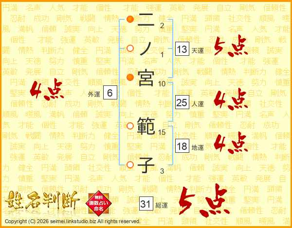 二(2画)ノ(1画)宮(10画) 範(15画)子(3画)