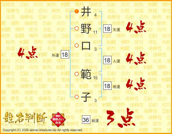 井(4画)野(11画)口(3画) 範(15画)子(3画)