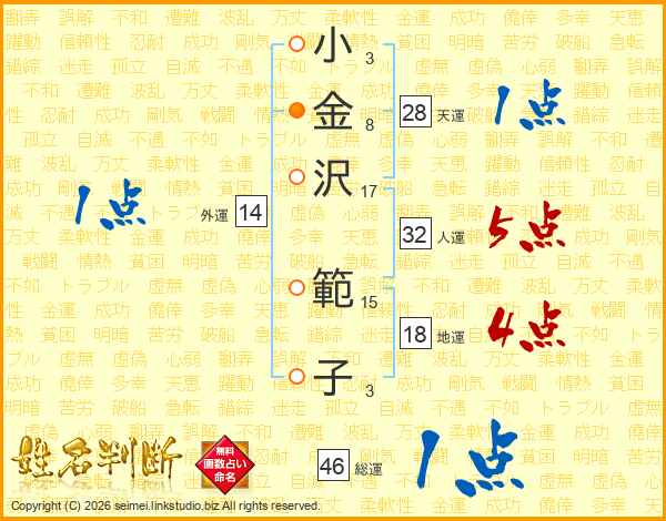 小(3画)金(8画)沢(17画) 範(15画)子(3画)