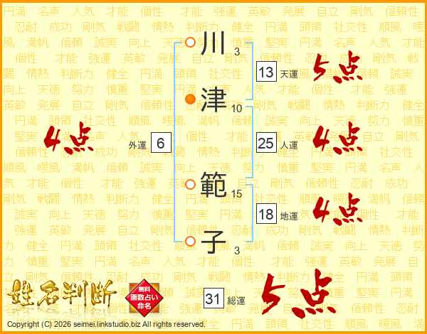 川(3画)津(10画) 範(15画)子(3画)