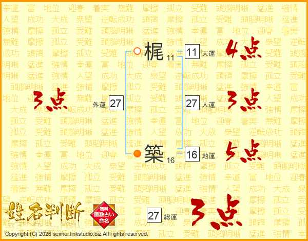 生活面を象徴する運勢です。外部から受ける影響力を表し、結婚運、家庭運や職場、環境への順応性を表します。総運から人運を引いた画数。姓や名が1文字の場合を除く。
