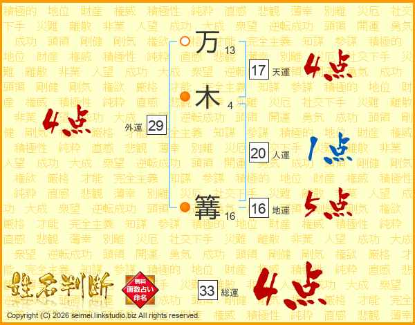 生活面を象徴する運勢です。外部から受ける影響力を表し、結婚運、家庭運や職場、環境への順応性を表します。総運から人運を引いた画数。姓や名が1文字の場合を除く。