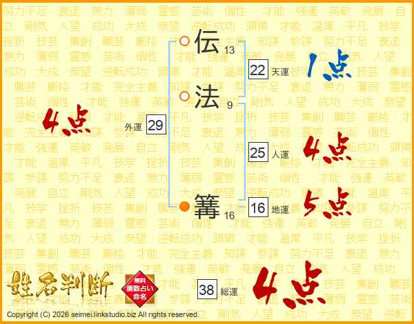家系が持つ宿命的な運勢を表します。祖先から受け継いだ苗字ですので自分の力が及びません。家柄を象徴します。苗字の合計画数。