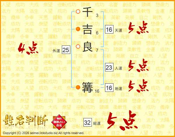 あなたの人生を表す1番重要な運勢です。生涯を通じて影響する総合運となり、主に50歳以降の晩年期に影響を及ぼします。苗字と名前の合計画数。