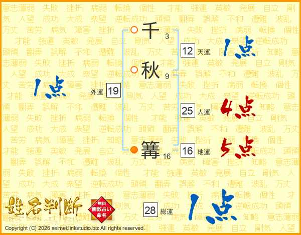 生活面を象徴する運勢です。外部から受ける影響力を表し、結婚運、家庭運や職場、環境への順応性を表します。総運から人運を引いた画数。姓や名が1文字の場合を除く。