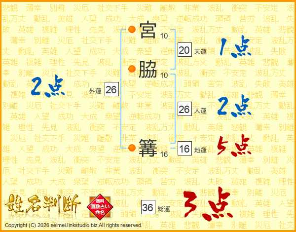 生活面を象徴する運勢です。外部から受ける影響力を表し、結婚運、家庭運や職場、環境への順応性を表します。総運から人運を引いた画数。姓や名が1文字の場合を除く。
