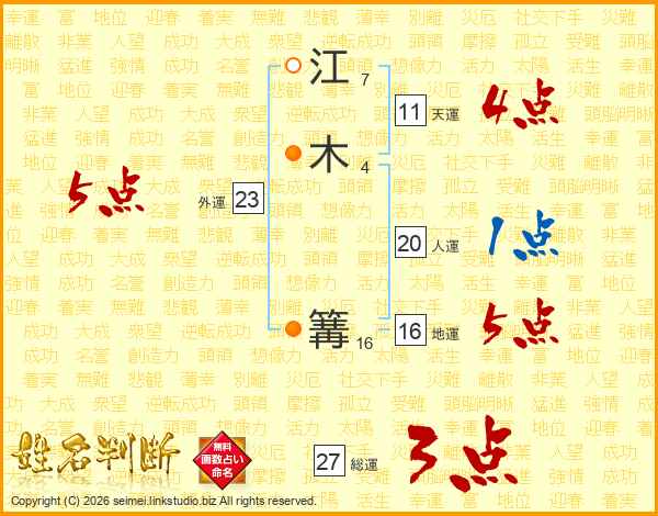 生活面を象徴する運勢です。外部から受ける影響力を表し、結婚運、家庭運や職場、環境への順応性を表します。総運から人運を引いた画数。姓や名が1文字の場合を除く。