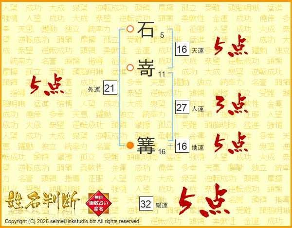あなたの人生を表す1番重要な運勢です。生涯を通じて影響する総合運となり、主に50歳以降の晩年期に影響を及ぼします。苗字と名前の合計画数。